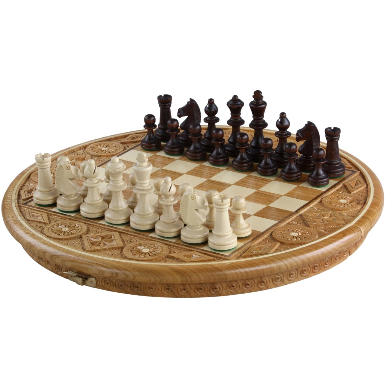 Un échiquier rond aux lignes ciselées, sculpté dans un bois de cerisier profond.